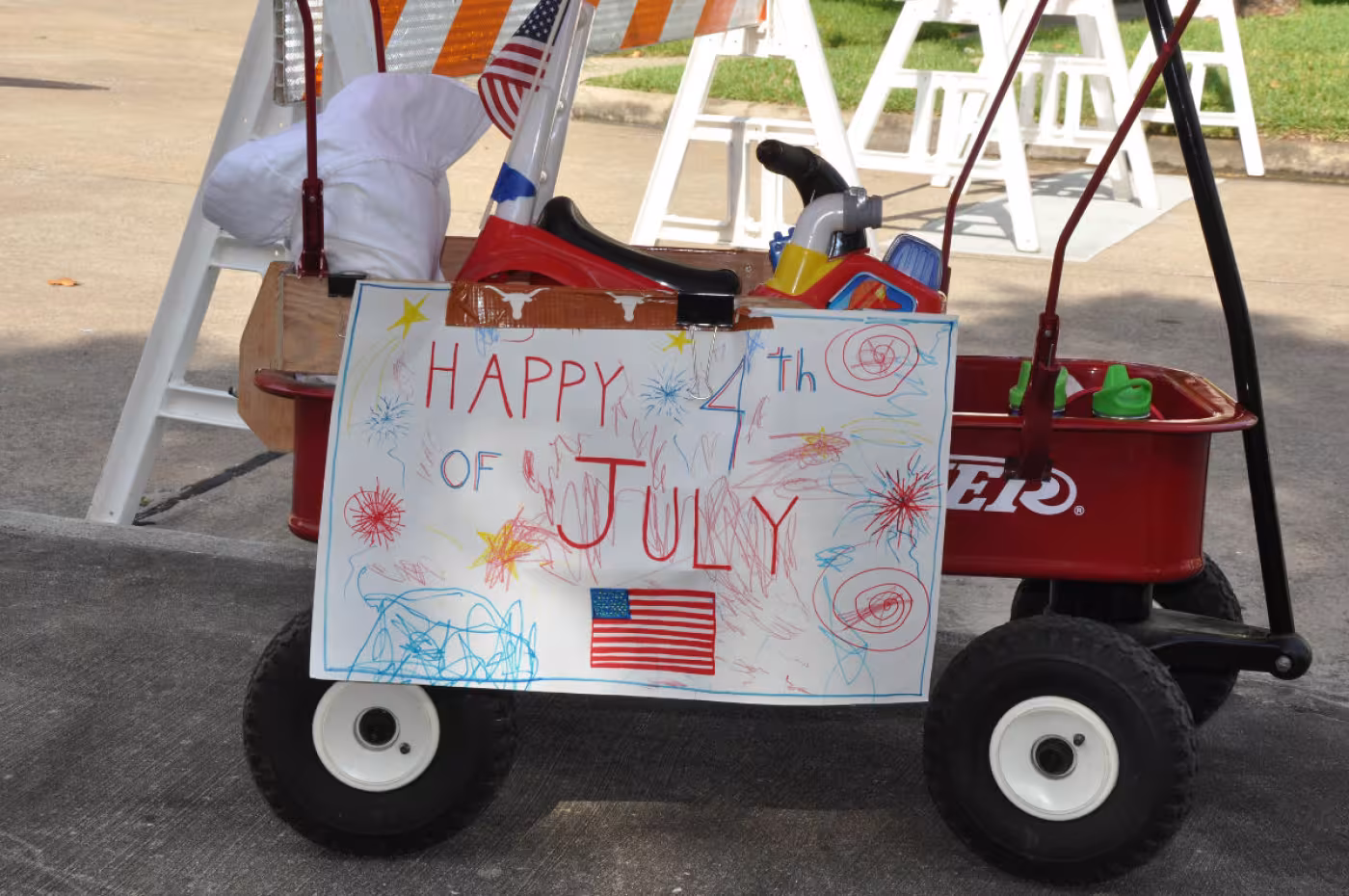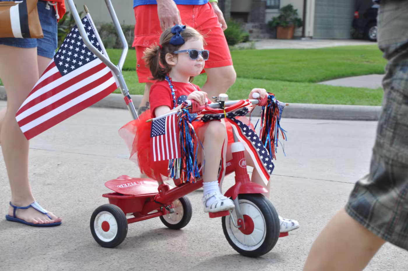 West University residents decked in red, white and blue came out in force for the neighborhood July Fourth celebration. The firetruck led the procession as kids rode their bikes and scooters or hitched rides in wagons pulled by their parents.