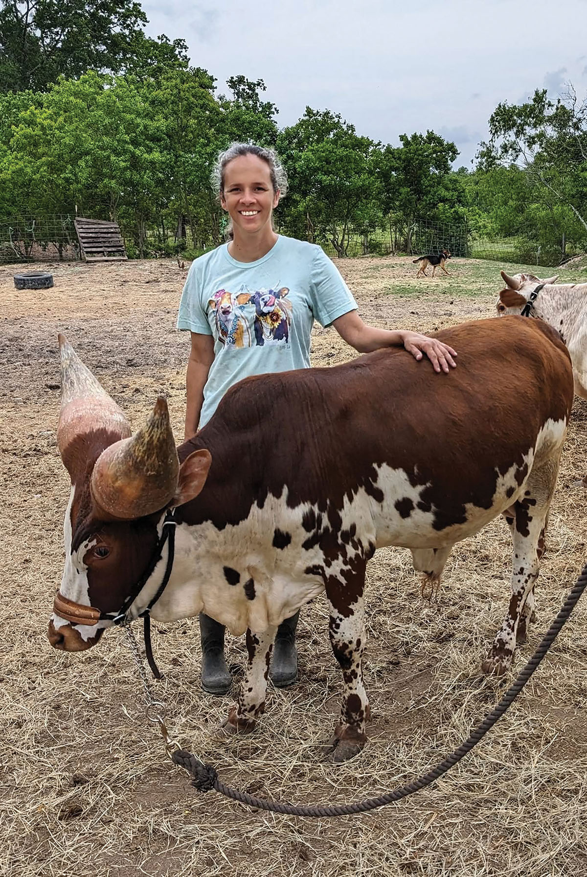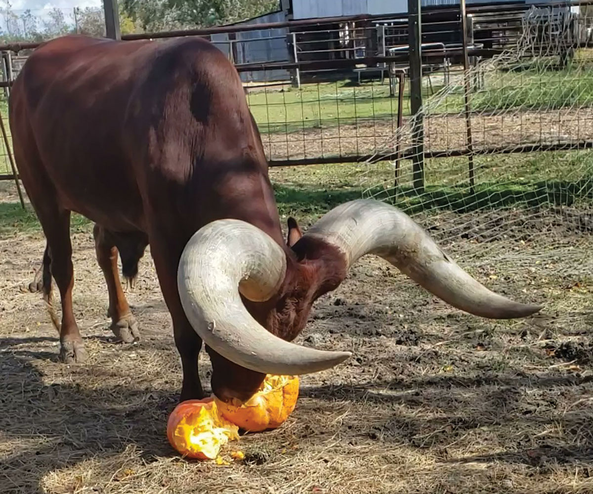 The most famous resident at Triangle B is Oliver the Watusi, a 21-year-old Watusi steer whose horns measure almost 10 feet from tip to tip and are over 26 inches each in diameter. Oliver is a gentle giant, hand-raised by Vincent, who even used to saddle him up and ride him in parades. Oliver recently retired. Last month was his last as the mascot on the Texas Motorplex in Ennis, where his fans could buy a plushie toy made in his likeness. Oliver has received two million likes on TikTok and has thousands of followers on his social-media platforms.