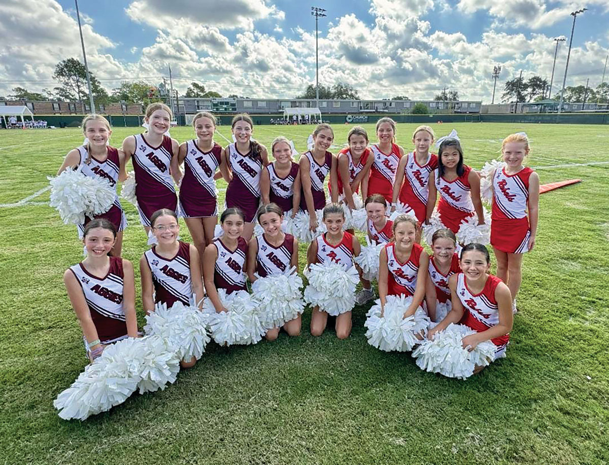 The Spring Branch-Memorial Sports Association varsity spirit squads for the Aggies and Rebels came together after a recent football game, celebrating camaraderie beyond the sidelines. The Aggies squad included (pictured, top row, from left) Emily Parks, Quinn McBeth, Olivia Cooper, Annie Albertine, Reese Baber, Louisa Foster; (bottom row, from left) Hattie Stellar, Avery Cole, Riley Roy, and Poppy Porter. The Rebels are represented by (top row, from left) Caroline Doherty, Emmy Allen, Lily Land, Bella Lim, Molly Purgason; (bottom row, from left) Hannah Dezso, Louise Elmore, Evie Murphy, Margaret Payne, and Maddie Winkler. While both teams cheered fiercely for their respective squads throughout the game, the athletes showed true sportsmanship by gathering afterward.