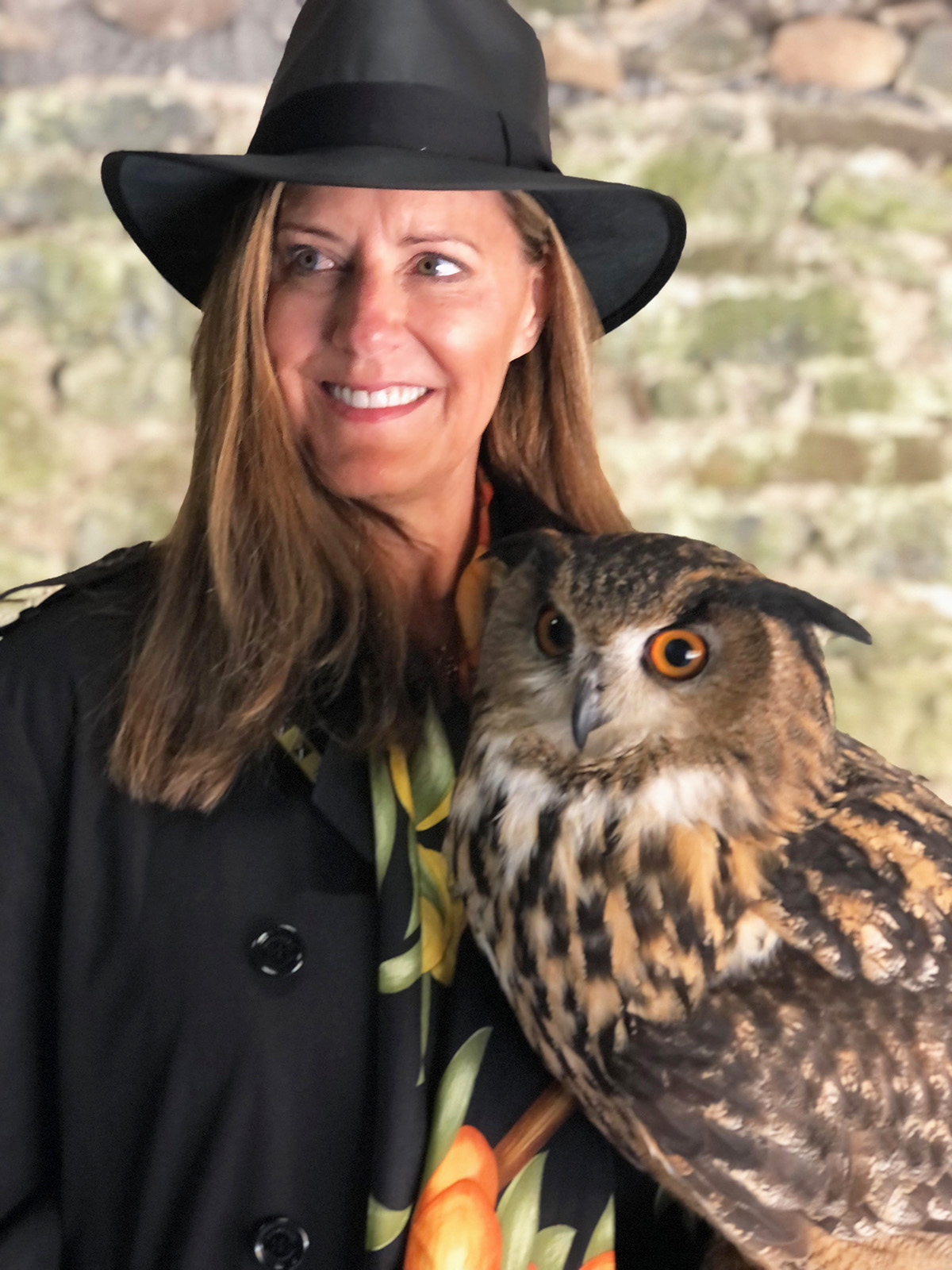 UK ADVENTURE Laurie and Kevin Foxx traveled through the UK. Pictured is Laurie with a barn owl at Cameron House in Scotland.