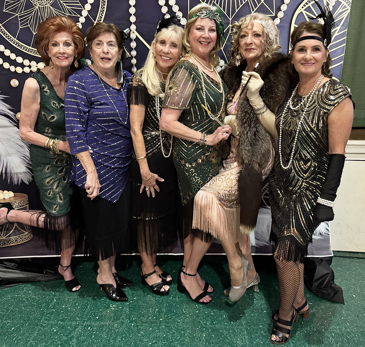 DRESSED TO KILL Pictured (from left) at Houston Junior Forum’s Death of a Gangster Murder Mystery Dinner are Karen Darnell, Carolyn Staples, Kathi Guillory, event chair Susan Fisher, Julia Heller, and Susan Loberg.