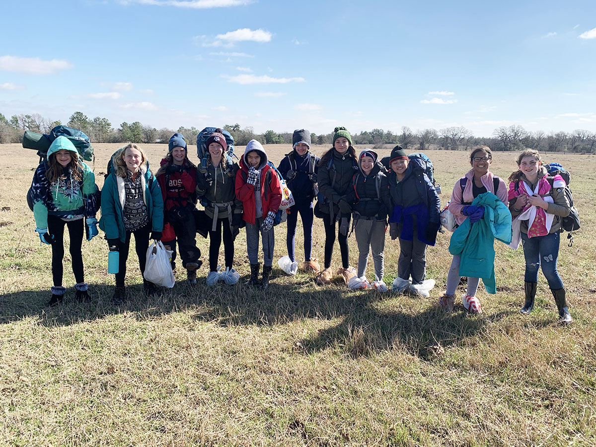 CAMPING DURING COVID During Covid years, it felt safest to be outside. In 2020, the girls went on their first backpacking trip. They spent one weekend carrying in and carrying out all of their sleeping gear, clothes, and food in the cold weather. They learned to build their own fires with kindling they found, and ate their first dehydrated backpacking meals. The plastic bags on shoes were to prevent disasters from happening by accidentally stepping on those cow patties. Girls pictured include Sloane Smith, Alexa Camp, Jenna Mirza, Isabelle DeGrange, Anneliese DeGrange, Skylar Campbell, Aria Jin, and Eden Harris.