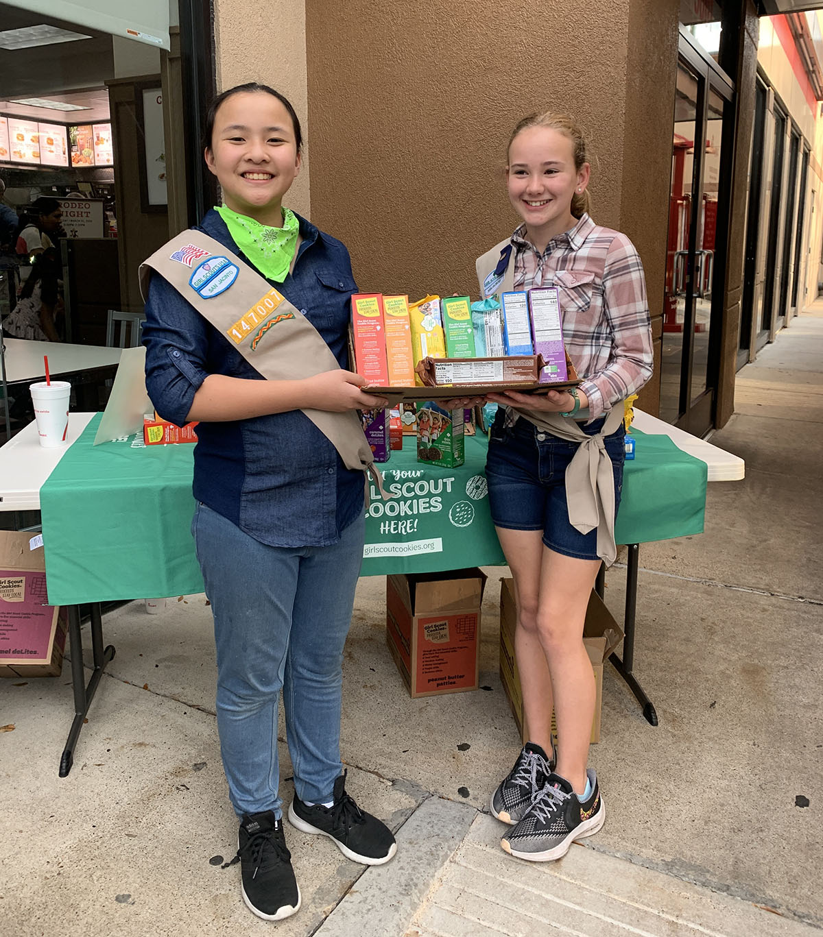 COOKIE TIME Aria Jin and Skylar Campbell selling cookies near the end of their elementary years. Selling cookies provides many life lessons for the Scouts, including building confidence speaking to adults, not being disappointed when someone doesn't buy, and coming up with a goal on how to spend the earnings wisely. The girls always did a combination of donating money back to the community and spending some on an outdoor trip.
