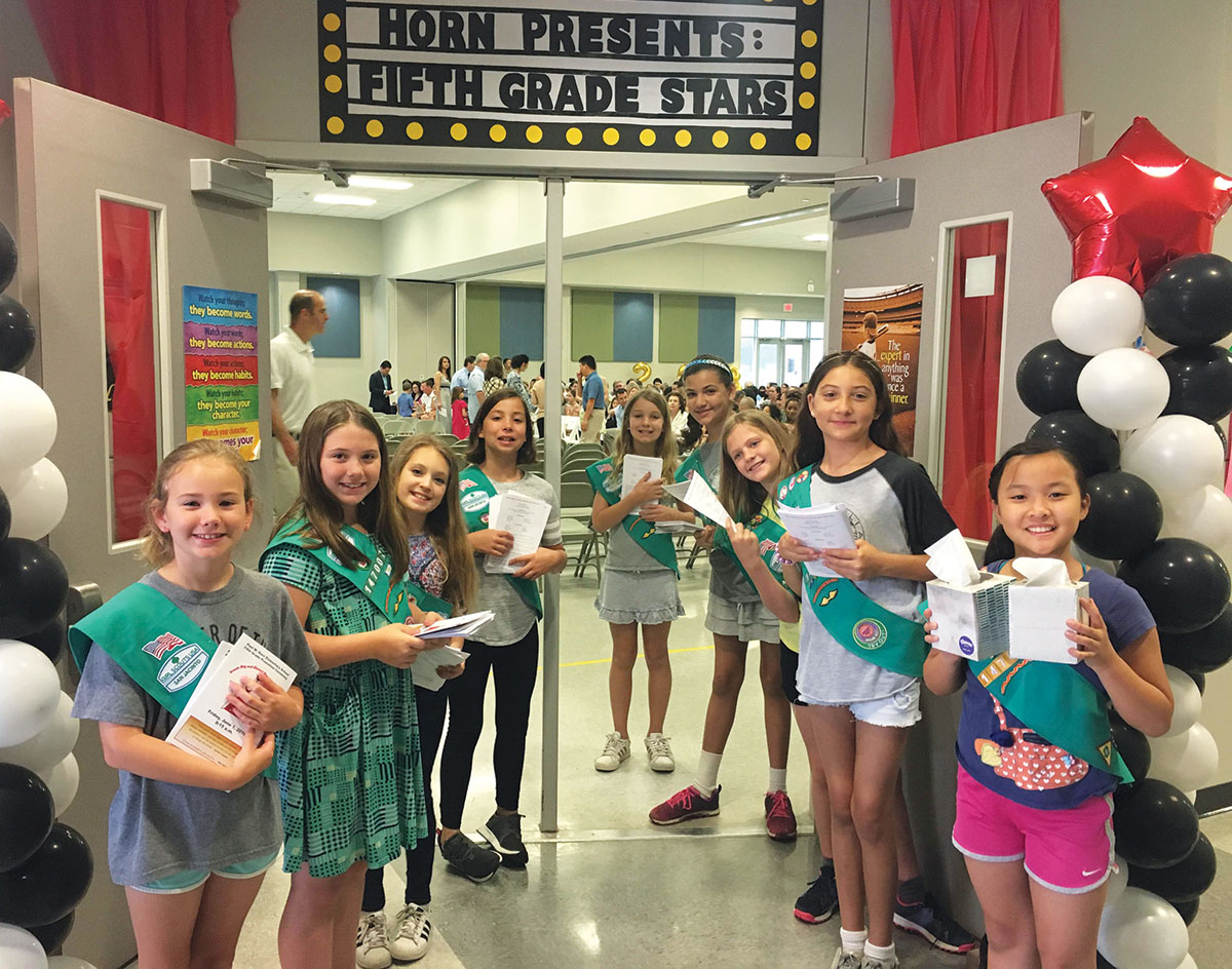 SMILES, SASHES, AND SERVICE Back in 2018, these bright-eyed Horn Elementary fourth graders from Girl Scout Troop 147007 helped make the school’s fifth-grade graduation extra special – handing out programs and tissues as proud families filed in. Formed in kindergarten, the troop began with all Horn students and has stayed strong ever since, even as some members moved away. Pictured, from left, are Skylar Campbell, Isabelle DeGrange, Alexa Camp, Anneliese DeGrange, and Aria Jin, who are still part of the troop today.