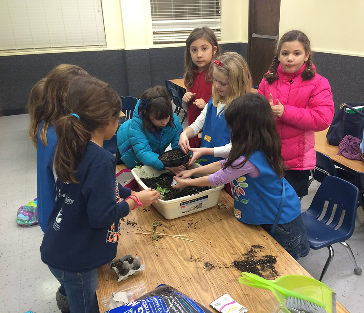 PLANTING SEEDS Here, the girls were in kindergarten and Daisies and were working together to plant seeds. One of the first troop meetings started with screen-free fun, making new friends, and learning about the world. Twins Anneliese and Isabelle DeGrange looking up.