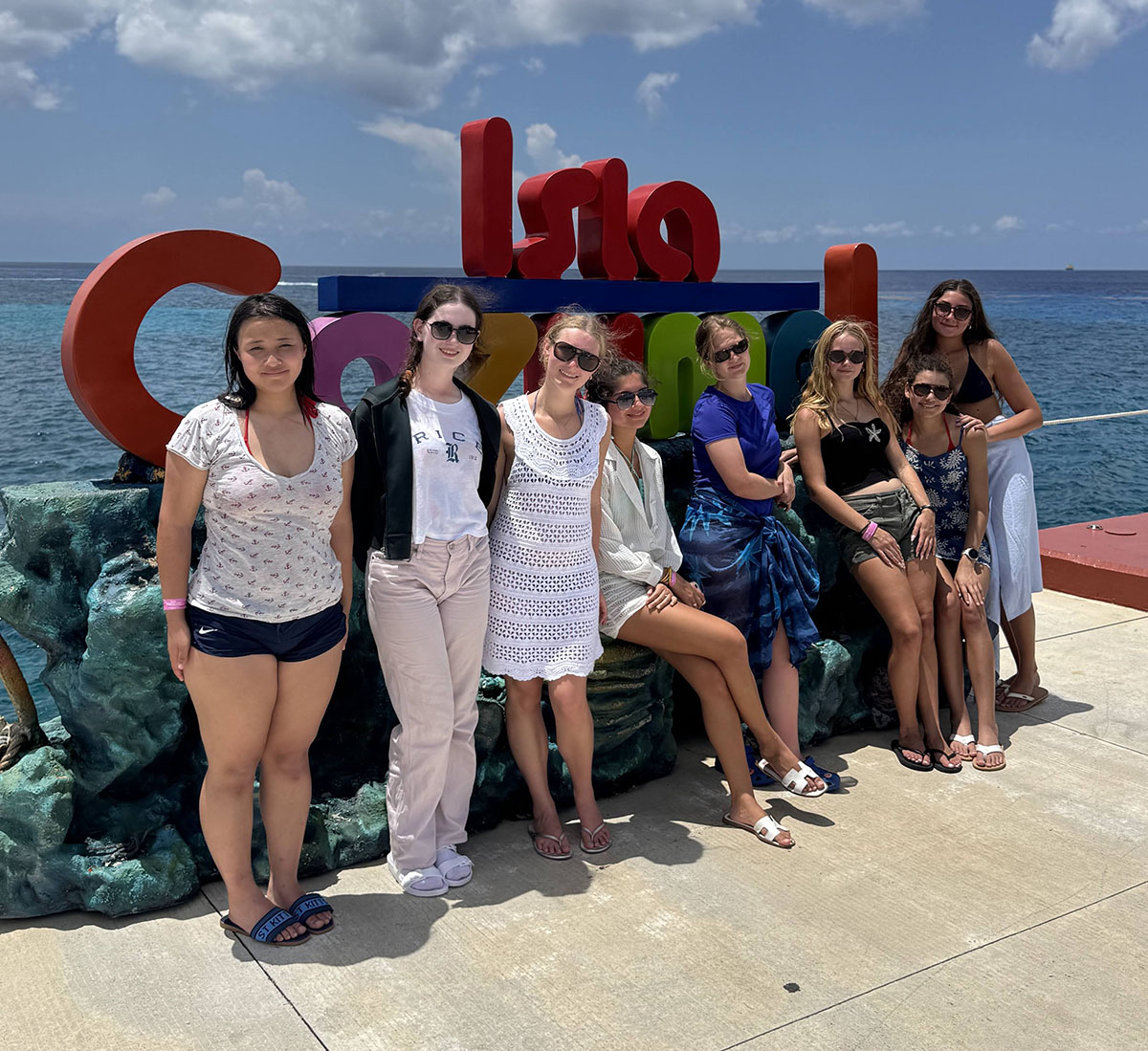 CRUISIN' The entire group with leaders on catamaran in front of Royal Caribbean cruise ship. Pictured are Isabelle DeGrange, Skylar Campbell, Eden Harris, Aria Jin, Erique DeGrange, Alexa Camp, Tania Campbell, Sloane Smith, Tina Villard, Jenna Mirza, and Anneliese DeGrange. The girls voted and picked this adventure which included snorkeling, playing in a private beach with water activities, and unlimited dancing on the catamaran.