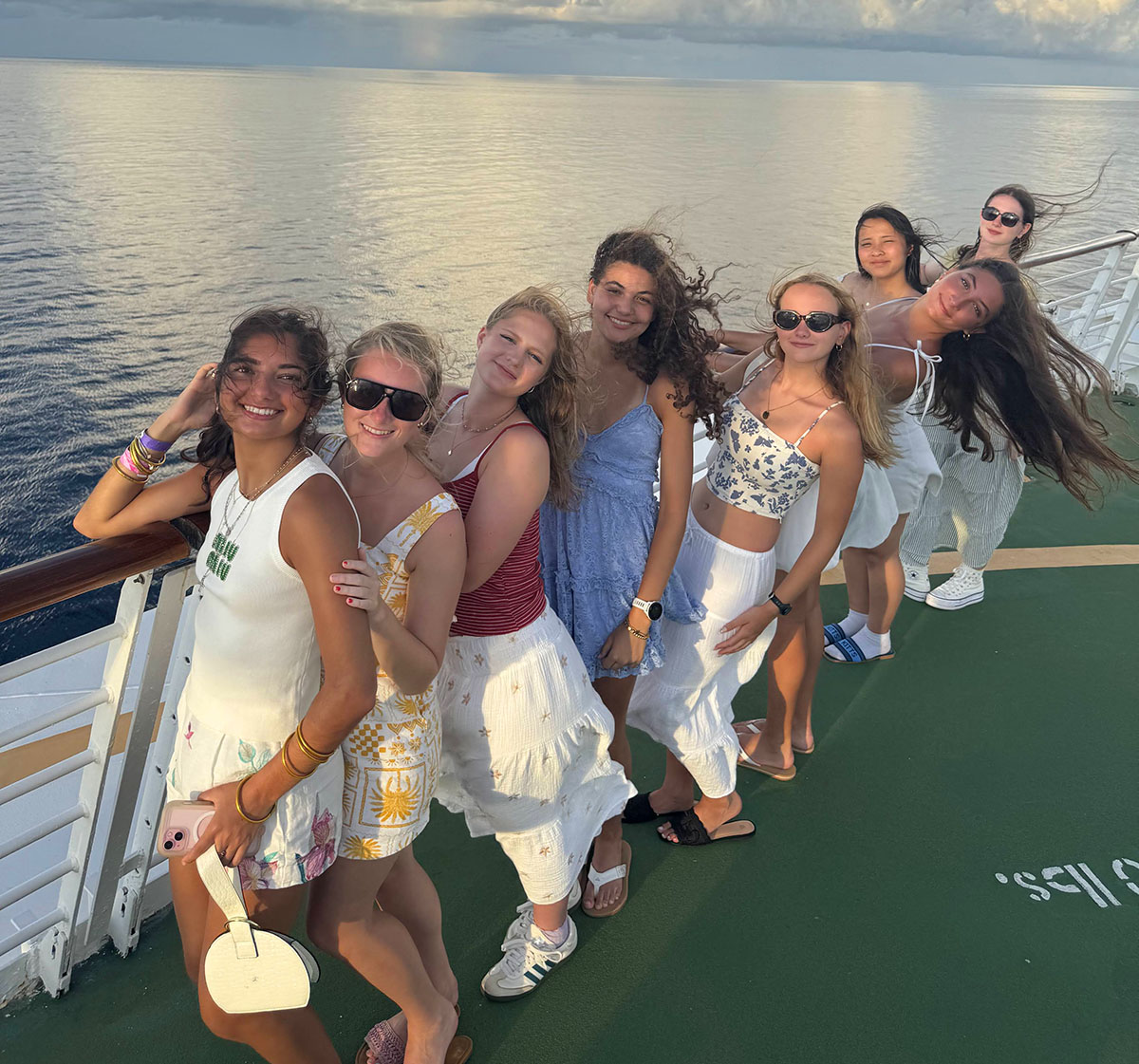 WIND AND WATER The wind blows in the girls' hair at the front of the ship. Pictured are Jenna Mirza, Sloane Smith, Alexa Camp, Isabelle DeGrange, Skylar Campbell, Anneliese DeGrange, Aria Jin, and Eden Harris.