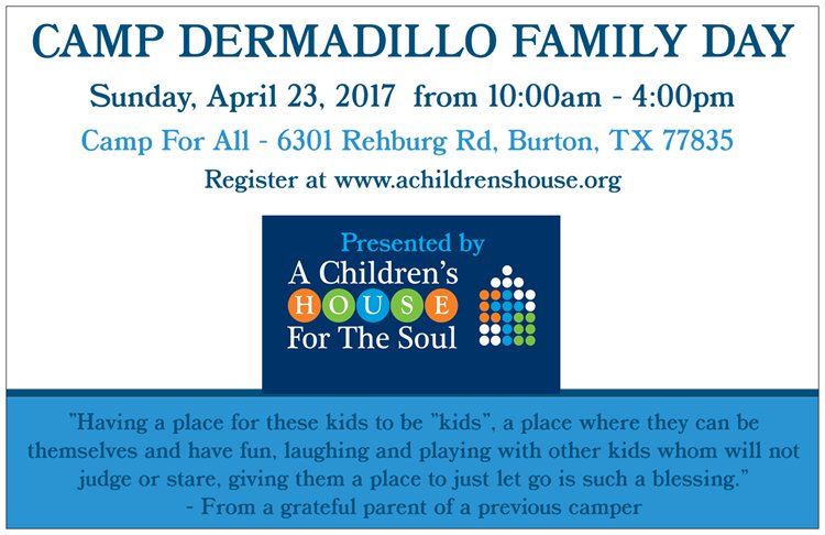 A Children's House for the Soul is offering children with chronic skin conditions and birthmarks, and their families, an opportunity to experience all the joy and discovery of Camp Dermadillo on Sunday, April 23, 2017. Family Day is designed to introduce parents and children to the happiness and freedom of attending a camp designed just for children with unique and challenging skin conditions and birthmarks. Camp Dermadillo, is a camp hosted by Camp for All at 6301 Rehburg Road, Burton TX 77835.