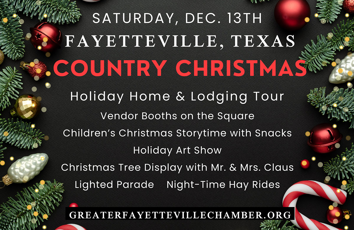 The 28th Annual Fayetteville Country Christmas celebration is on Sat., Dec. 13. Join for a full day of family-friendly holiday festivities! Start the morning off shopping and dining in and around the square at local establishments and arts & craft booths. Enjoy the Homes Tour and join in or watch the lighted parade at 6 p.m. Enjoy caroling around town after the parade. See the annual Christmas Tree Decorating Contest display and meet Santa in the Old Firehouse. There will be a Holiday Show opening at ARTS for Rural Texas with a reception from 4-6 p.m.