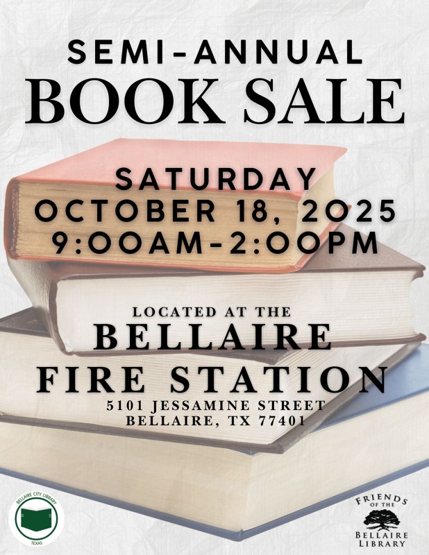 The Friends of the Bellaire Library's Fall Book Sale will be held at the Bellaire Fire Station on Saturday, October 18, 2025, from 9 a.m. to 2 p.m. Browse through a wide selection of books in the shade of the designated fire station bays!