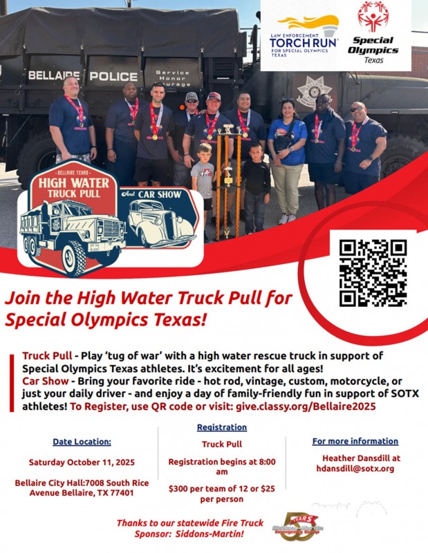 Join the City of Bellaire and Special Olympics Texas for the ultimate tug of war challenge! Test your strength and compete for prizes and bragging rights...all for a great cause: to support Special Olympics Texas area athletes. Bring your biggest fans to cheer you on during your pull – it’s excitement for all ages!